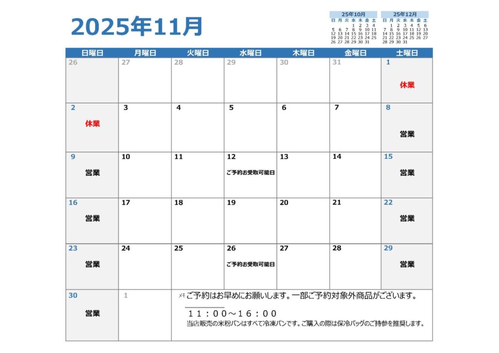 11月の営業予定